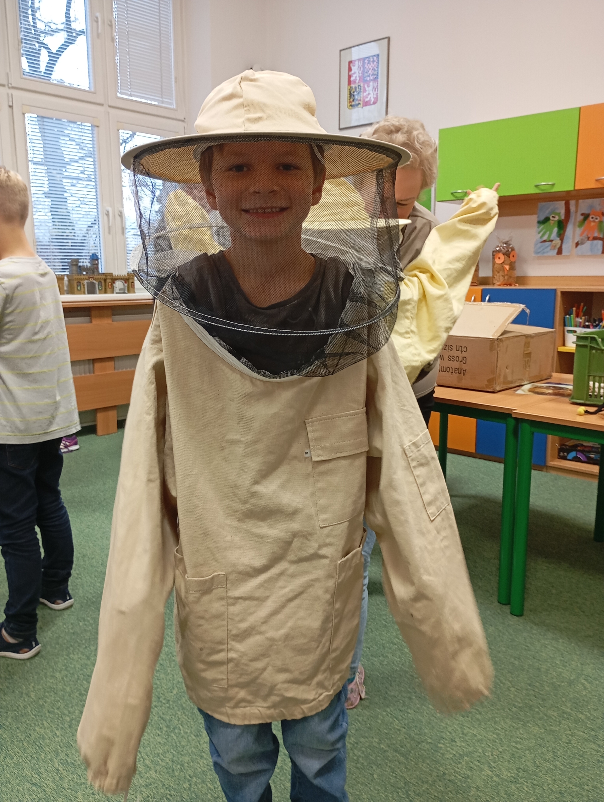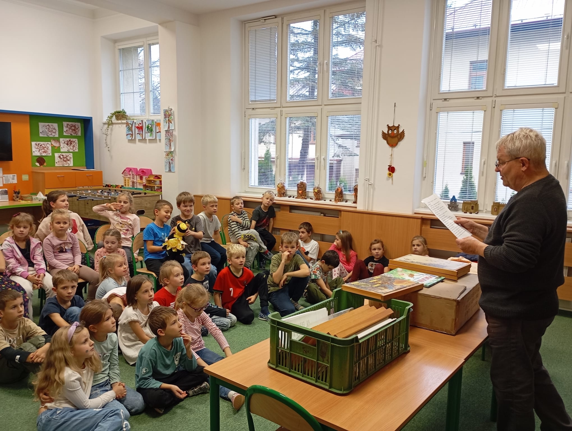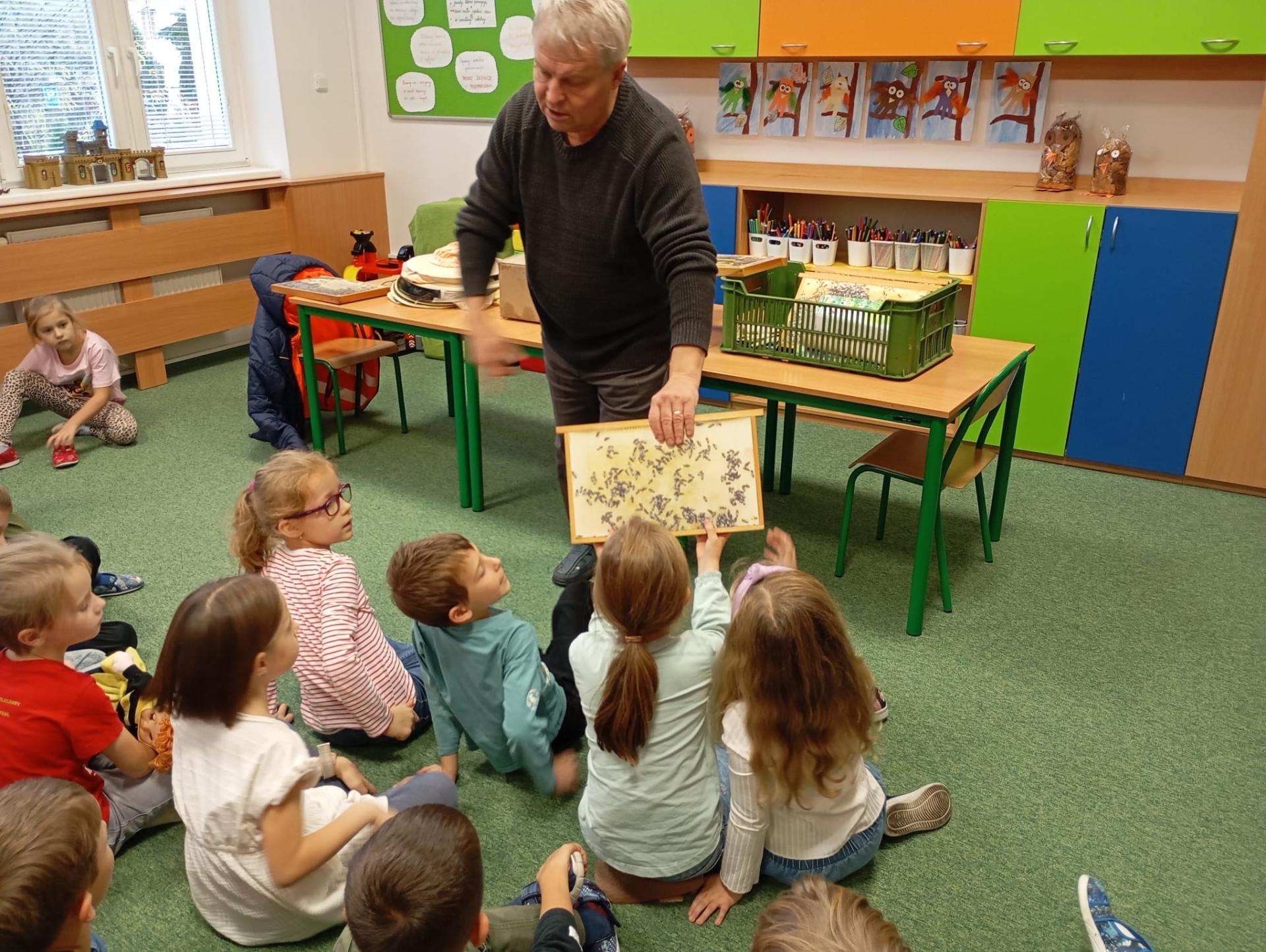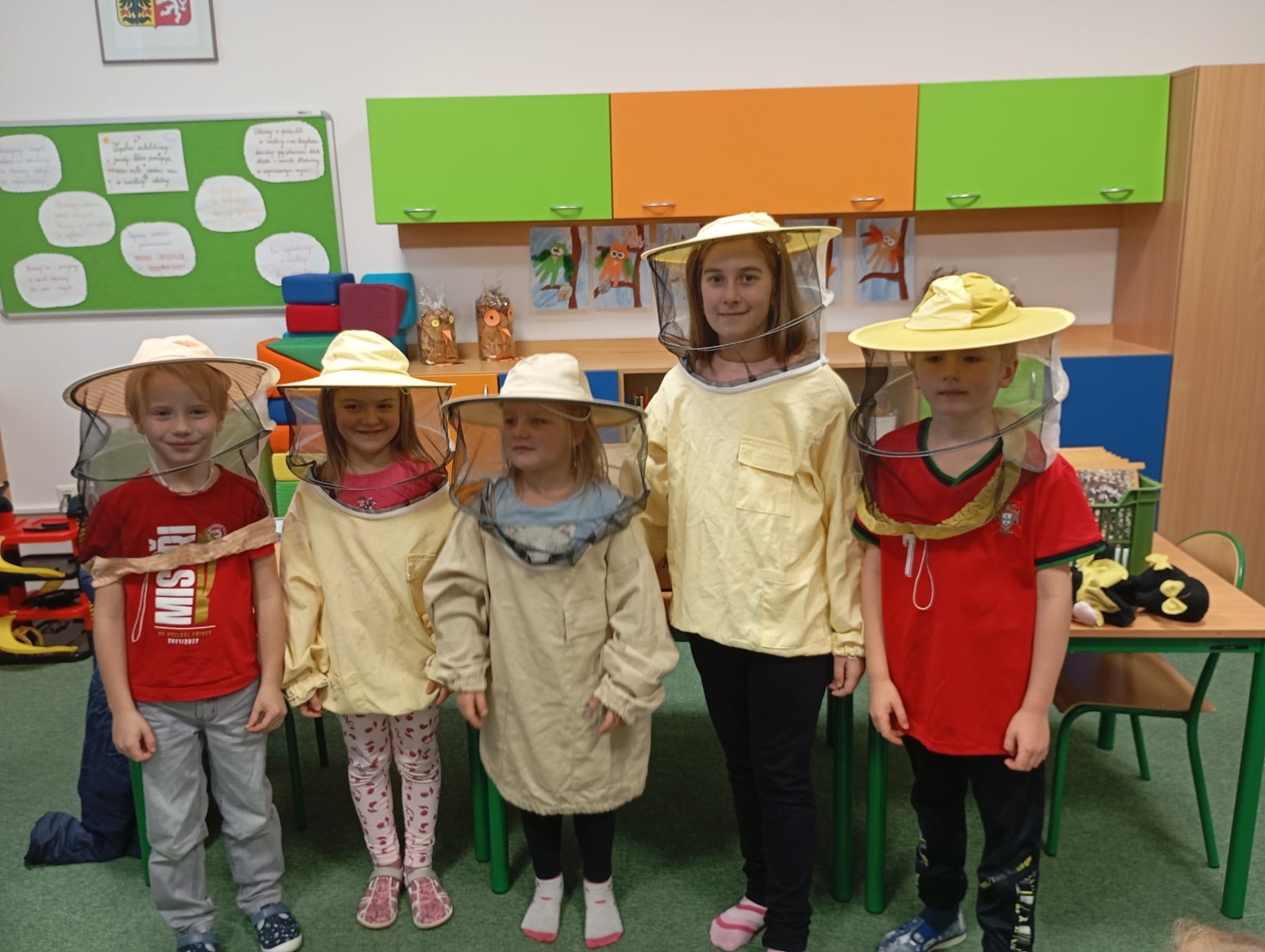 W świetlicy szkolnej odbyło się ciekawe spotkanie z pszczelarzem, który opowiedział dzieciom o życiu pszczół i ich ogromnym znaczeniu dla przyrody. Uczniowie dowiedzieli się, jak powstaje miód oraz dlaczego pszczoły są tak ważne dla człowieka i środowiska. Nie zabrakło również przymierzania prawdziwego stroju pszczelarskiego.